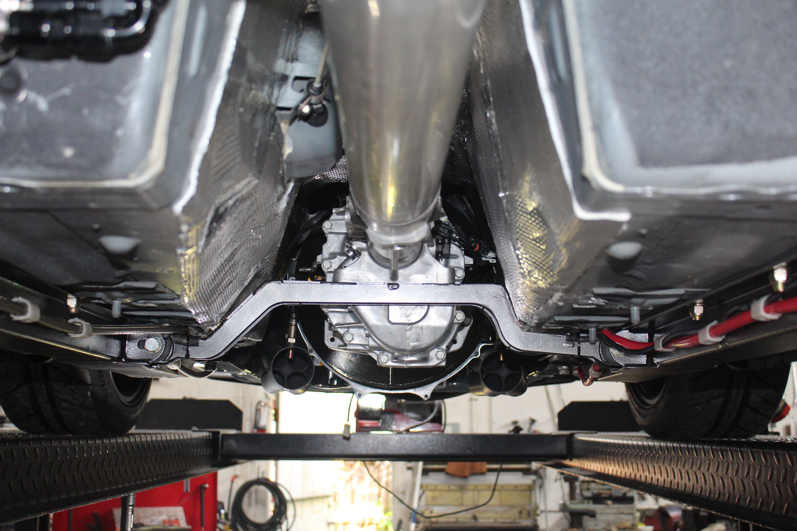 - Transmission cross member with provisions for 3 exhaust routing for T56 transmission and Energy polyurethane mount. Made from DOM tubing.